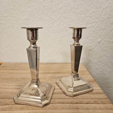 Et par vintage stager af plet, trekantet. H. 6 cm. I fin stand uden fejl. Fast pris.