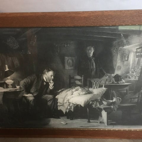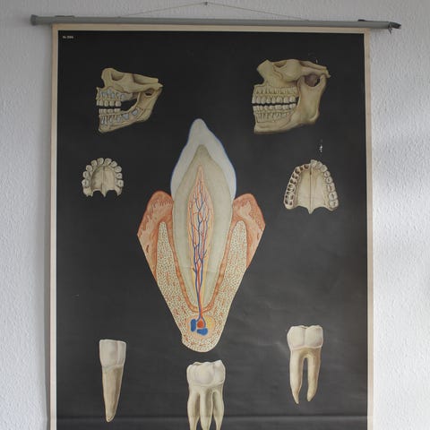Vintage anatomisk planche / skolekort med øjets opbygning / øjenlæge, oprullet på pinde og med tekstilryg. Kort størrelse (uden pinde) 67 x 99 cm. I pæn stand med almindelig brugsslidtage.