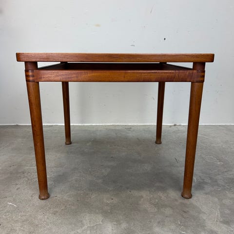 Kvadratisk sofabord i fineret teak med massive kanter og ben ,underliggende tremme hylde