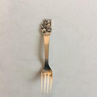 Barnegaffel af sølvplet / totårnet med motiv fra Fyrtøjet af H. C. Andersen. L 15,8 cm. I pæn stand med almindelig brugsslidtage.