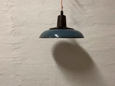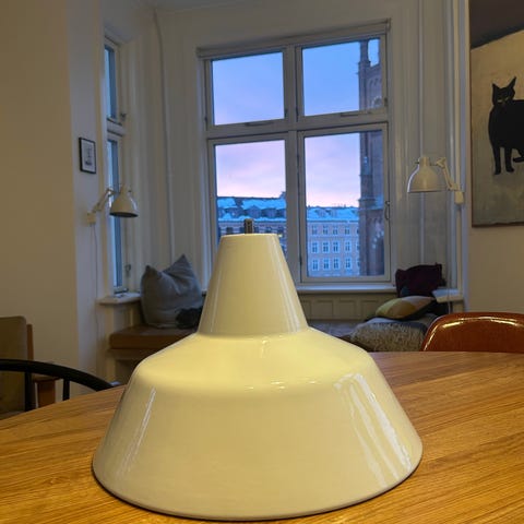 Værkstedspendel/arbejdslampe i hvidlakeret aluminium.