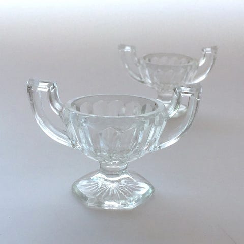 Stor samling ældre saltkar af presset glas samt slebet krystal. Sælges stk. vis til 20,- pr. stk. I pæn stand, enkelte kan havde mindre hak. Perfekt til stor fest mm.