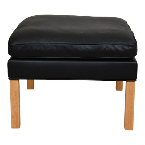 Børge Mogensen fodskammel model 2202 i sort læder, og ben af egetræ. Skamlen fremstår senere ombetrukket for omkring 5 år siden.