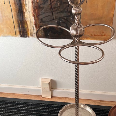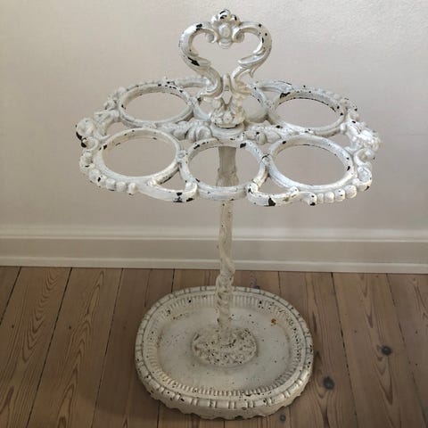 Gammelt, patineret stativ/kurv, udført i metal, med udsmykning i sølvgråt metal.