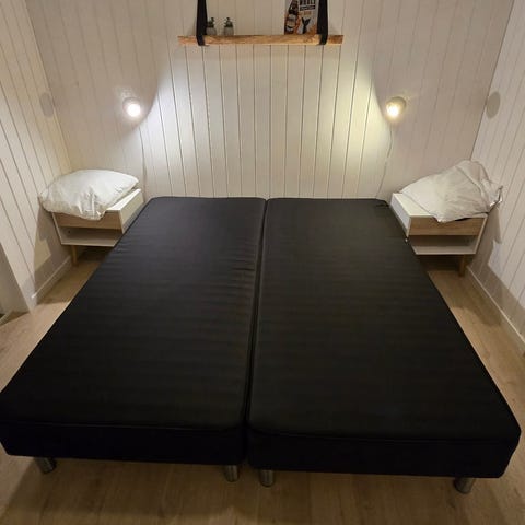 Næsten ubrugt madras med koksgråt betræk, i perfekt stand, med bøgetræs ben.