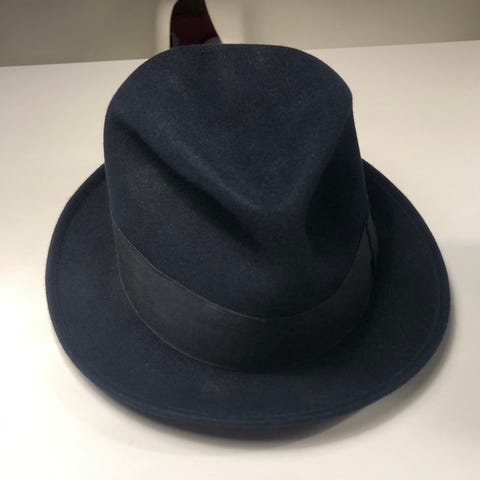 Sort fedorahat af filt fra Bormida, Milano, Italien. Importeret af Axel Kaufmann, Aarhus, København. Midten af 1900 tallet. Størrelse 57.