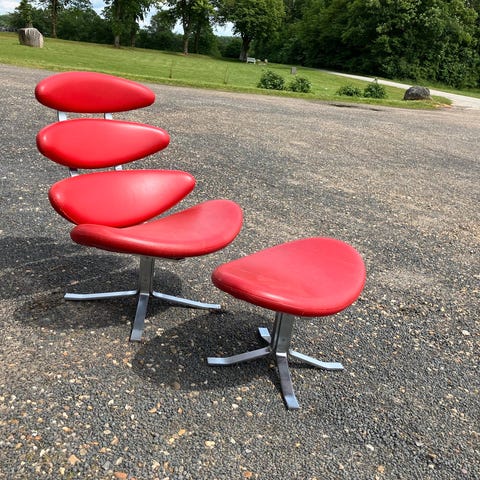 Poul M. Volther Corona skammel betrukket med nyt walnut anilin llæder, og med mat forkromet stål stel. Skamlen er fra omkring år 2000, og fremstår i god stand og er betrukket med nyt læder samt skum.