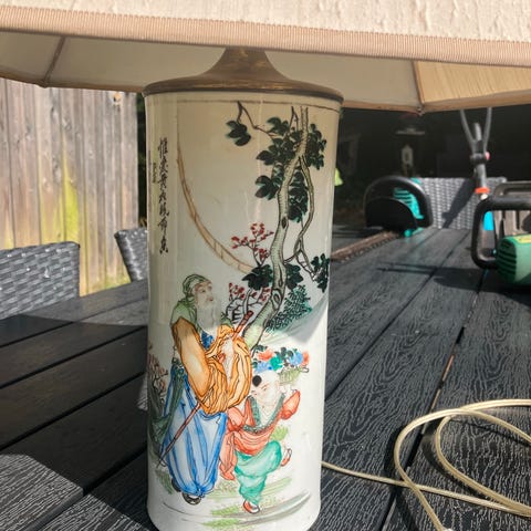 Fin gammel lampe på træfod, med motiv af krigsscene.