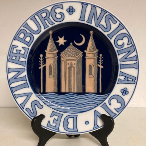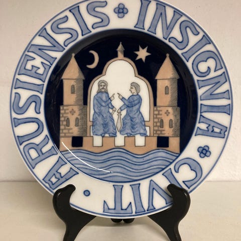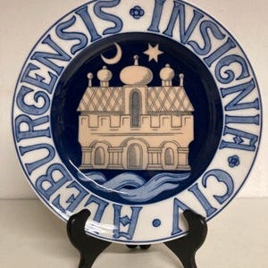 Ud af en serie af platter, med motiver af byvåben, her for Civitatis Othiniæ anno 1535, eller Odense, som byen hedder i dag.