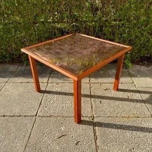 Trekantet sofabord af massiv teak træ med kehlet kant produceret hos Bc møbler. Bordet er fra omkring 1960'erne, og fremstår i flot stand, dog med enkelte minimale ridser på bordpladen