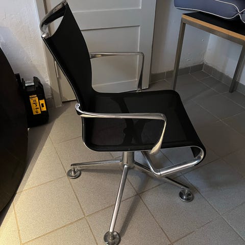 Stolen har aluminiumsstel og sæde/ryg er betrukket med sort mesh.
