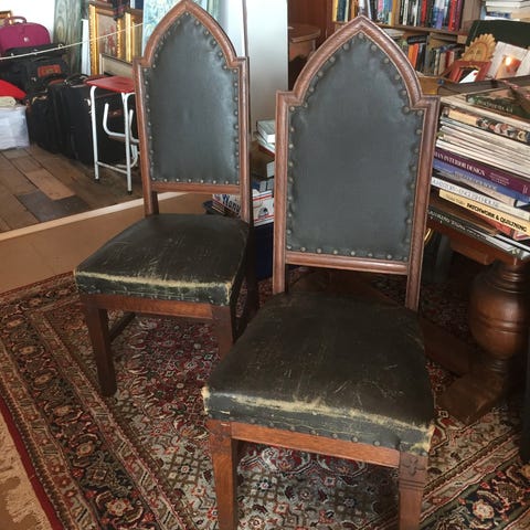 Et sæt af i alt 13 stk. Art Nouveau spise stole af rigt udskåret egetræ med messing søm beslået læder (nogle af kunstlæder) og på lige tilspidsede og kanalerede ben. Omkring år 1900. Stel meget faste. Mål: H. 94. B. 45. D. 45 cm. Siddehøjde 47 cm. Sælges kun samlet. Proveniens: Hidhører herregård på Djursland.