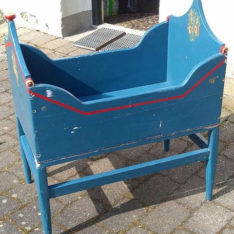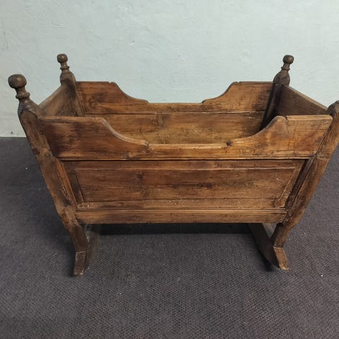Gammel, gedigen vugge, med god stabilitet, udført i massivt fyrretræ, på gyngemeder.