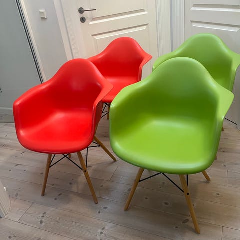 Et par stole, udført i skal af rød plast, på pyramideformet stålstel med drejefunktion.