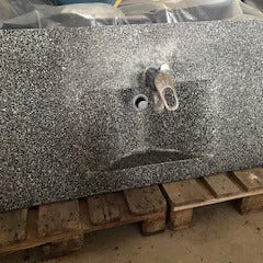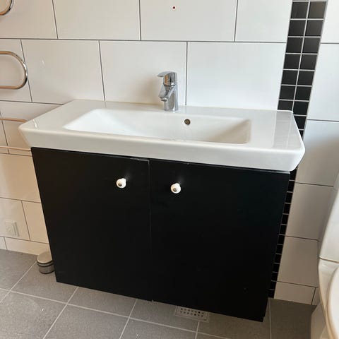 Badeværelsesmøbel bestående af lamineret grå bordplade og to runde håndvaske med Hans Grohe Talis S2 armaturer. Det hele i rigtig fin stand, dog en vask med lille reparation på bagside / underkant som ikke ligges mærke til. Mål: Bord H. 3. L. 169,5. D. 50 cm. Vask mål uden armatur H. 21,5. B. 48. D. 50,5 cm. Pose med monterings skruer bagslag medfølger. Sælges kun samlet.