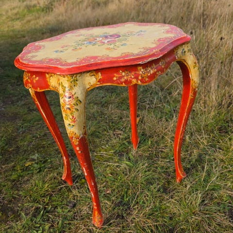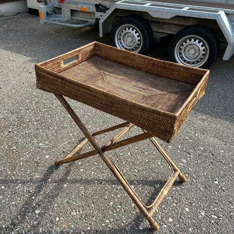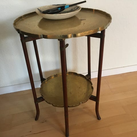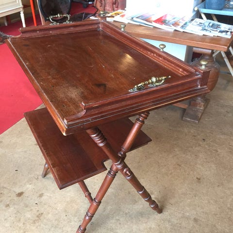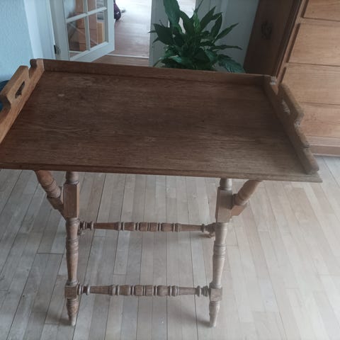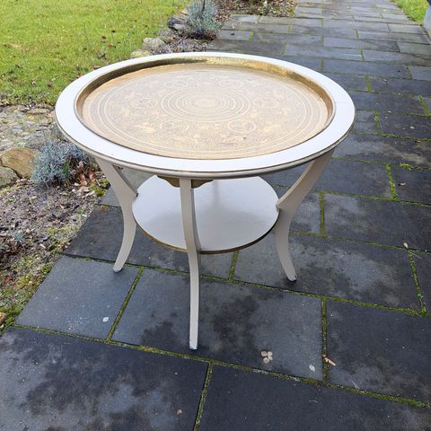 Bakkebord af lakeret træ, belagt med perlemor, håndtag med messing. Cirka år 1900. Med senere stel af mahogni. H. 79. B. 69. D. 49 cm. Med lidt manglende perlemor, se fotos.