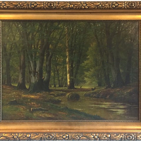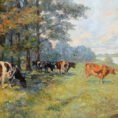Frokost i mark med græssende køer. Signeret og dateret: A. Rüdinger, 99. Olie på lærred i ramme af forgyldt træ. Enkelte begyndende krakeleringer; ellers i fin stand. 82 x 109 cm. Ramme 97 x 123 cm.