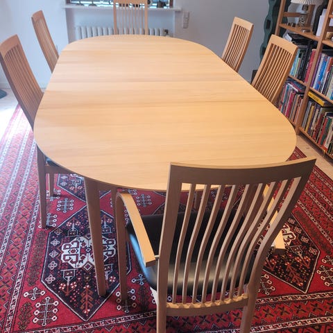 Dansk produceret haslev ovalt spisebord i massivt ubehandlet bøg. Der er udtræk med plads til 2 plader.