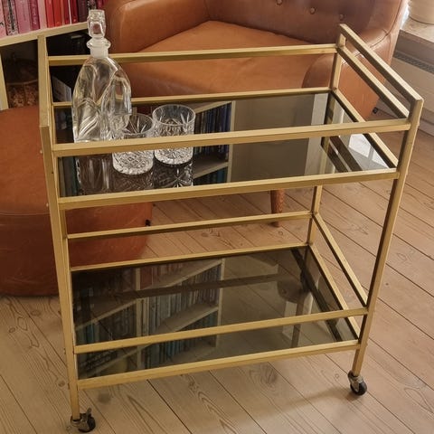 Guldfarvet rullebord med flaske- og glasholder (gratis levering)