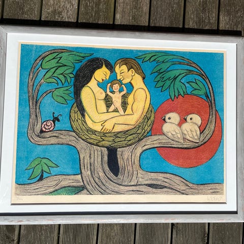 Henry Heerups pragtlitografi fra 1974, trykt i sort og rødt efter et sort/hvidt linoleumssnit, der kun kendes i ganske få ekspl. Oplaget var 180 + 48 med romertal og nogle ganske få kunstnereksemplarer betegnet H.C (Hors commerce - der betyder uden for handel).