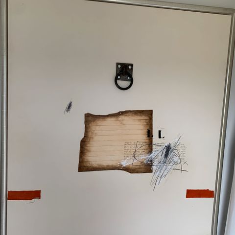 Rasmus Nielsen maleri - collage kaldet ‘conspiracy theory’ mixet media. Et kunstværk hvor tankerne der er tænkt får en til at tænke ‘dybt’. …….