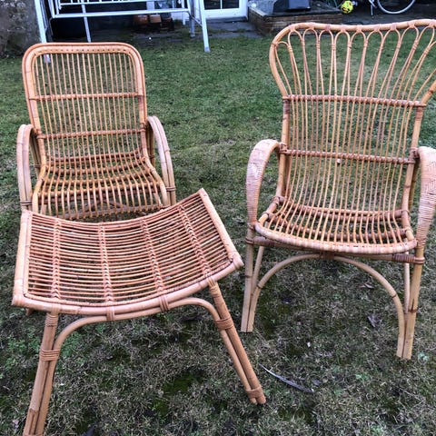 Smukke højrygget bambus/rattan lænestole med flettet kant. Sædehynder i imiteret lammeuld.