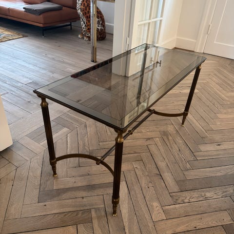 Vi er ovre i denne her Hollywood Regency style med dette franske bord i messing og glas, med fake bambus stel. Det måler 64 cm B, 45 cm D og er 45 cm H. Det er fra 1960 erne. Selve glaspladen er "smoked". Denne vare sendes ikke, skal hentes i butikken, eller kan leveres mod betaling.