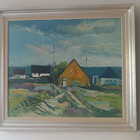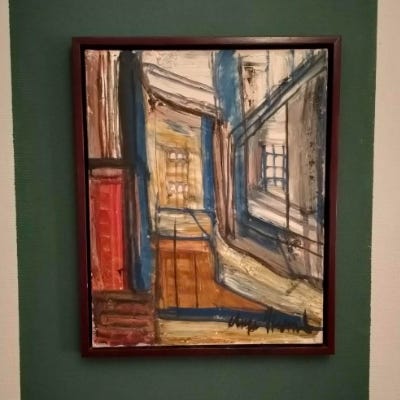 Aage Strand oliemaleri. Billedet illustrere ´den orangefarvet dør på Godhavnsgade`. Et enkelt kraftfuldt billede som ´taler uden at sige meget`. Skiller sig ud fra hans andre malerier hvilket gør det unikt. .....