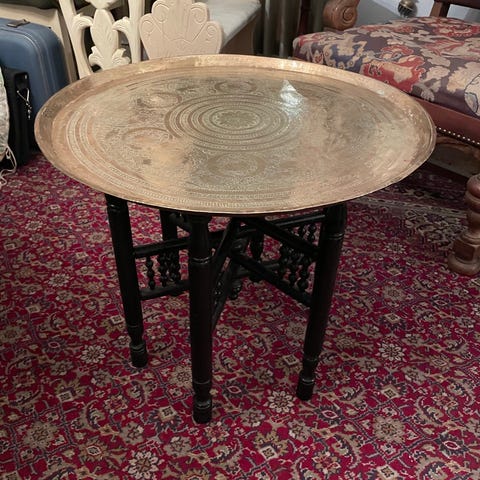 Butlerbord / butlers table af lakeret nøddetræ, med håndtag og galleri af messing. Sammenfoldeligt. Sidste halvdel 1800 tallet. Med nye remme. Bordplade med lidt mærker, Mål som på fotos: H. 84. L. 79. D. 49 cm. Stel sammenfoldet H. 88. L. 67. D. 9 cm.