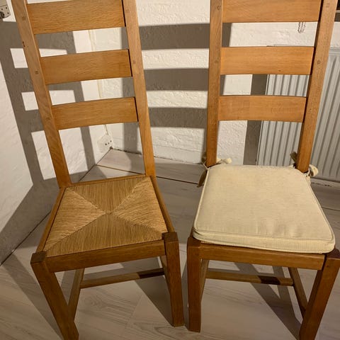Gode tunge solide stole i massivt egetræ med lyst vaskbart mikrofiberstof.