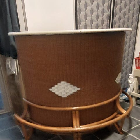 Fint møbel, med skelet i bambus, samt baren i plade, malet i mørk almuegrøn og smykket med bambuspinde.