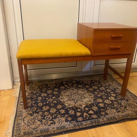 Super fed bænk i fineret teak. Designet i 1962 af Bertil Fridhagen for Bodafors. Den måler 1 m x 38 cm D og er 42 cm høj. Denne vare sendes ikke, skal hentes i butikken, eller leveres mod betaling.