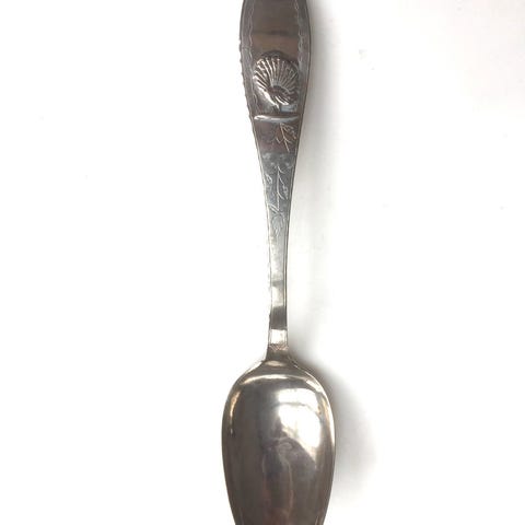 Ske indgraveret med bladværk. Bagside punslet, utydeligt. Udgået og stemplet fra Mathias Möller, Haderslev (1813-1868). L. 22,6 cm. Vægt 41 gr.