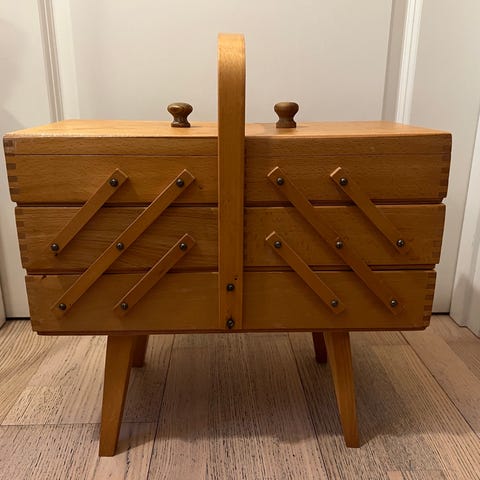 Skønneste syskrin i retrostil med hvidmalet flet og blomstret stof. Læg mærke til den orange lille bakke, der hviler på kanten under låget. Der kan være mange dimser 🤩 Højde 42 cm. Dia 30 cm. Flot stand kun med lidt nus. Dog når stoffet på siderne ikke helt ned. Men det er rimelig let at ompolstre den, om man vil.