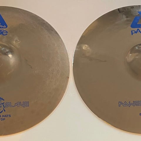 Toppen er et tyndt crashbækken fra 1971 og bunden er et tykt march-bækken (Marching) fra 1978 - begge Paiste 2002 'Black label'.