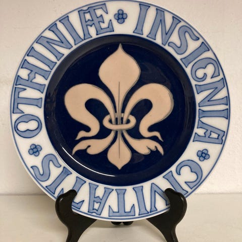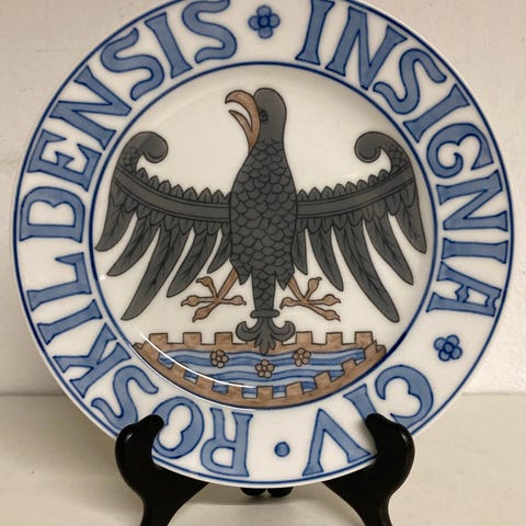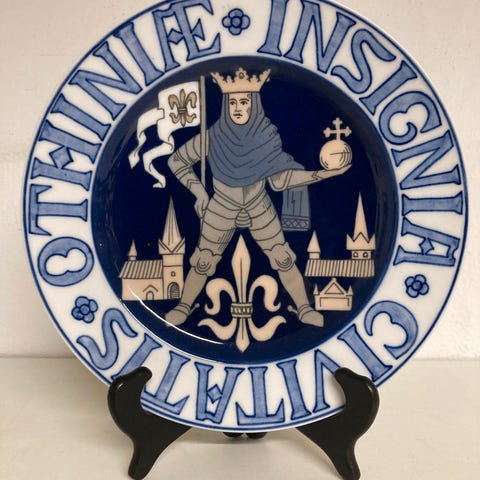 Ud af en serie af platter, med motiver af byvåben, her for Civit Hafniensis anno 1661, eller København, som Vores hovedstad hedder i dag.