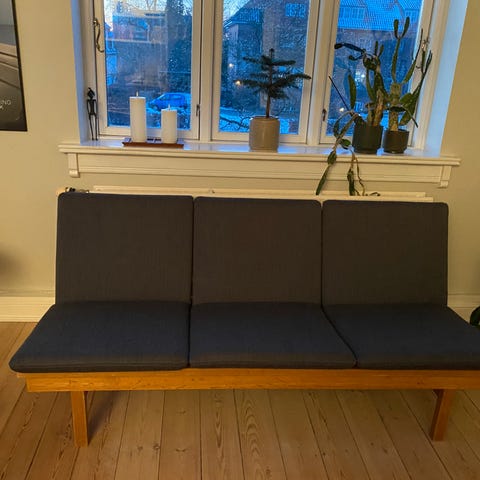 Brugt, nyistandsat 2218 3 pers. sofa. Nye hynder og med stel i egetræ.
