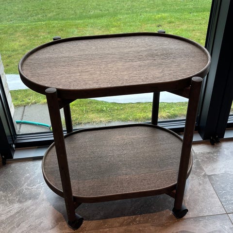 Fedt rulle bord i mørk eg med hylde og lyse fliser