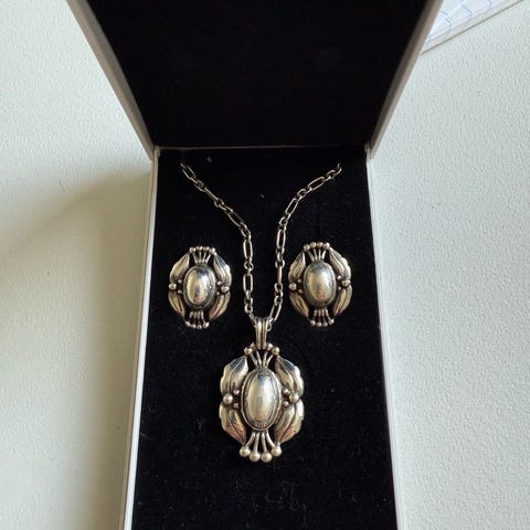 Flot og moderne vintage sølv sæt 925 med isatte grønne agater . Agat og stempel i hvert vedhæng på bagsiden. Gammelt fint sæt og smukt for alderen . Kan pudses yderligere op hos en guldsmed. Smukt sæt! Georg Jensen inspireret.