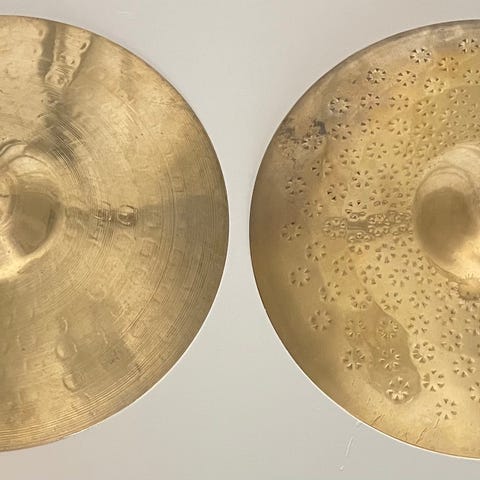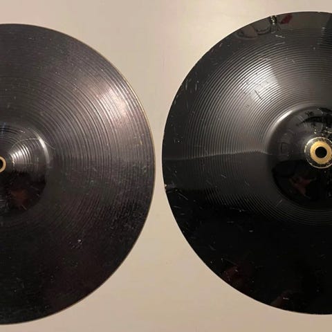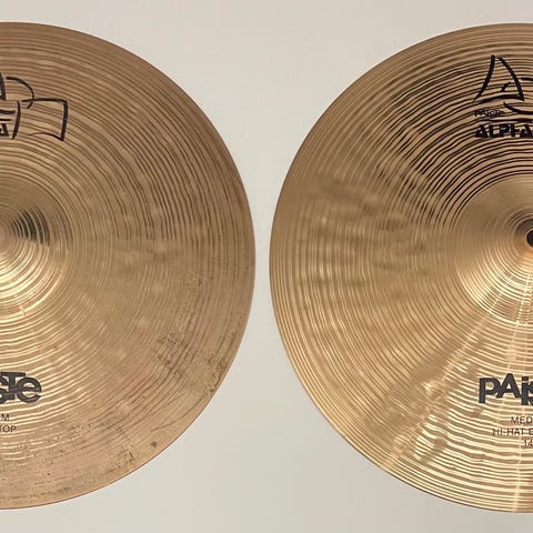 Hi-hatten er blevet renset, på begge sider, så den skinner og så logoerne (på bundbækkenet) er helt intakte.