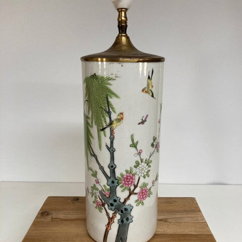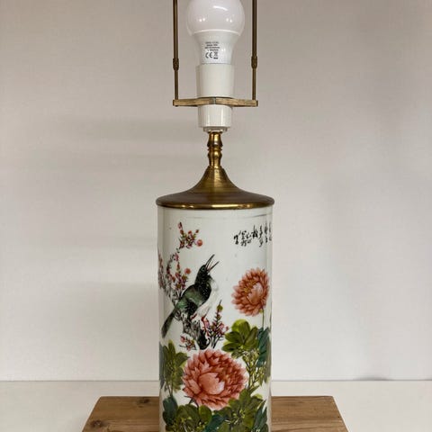Smuk, med kugleformet krop, udsmykket med typiske kinesiske motiver, forsynet med rosafarvet skærm.