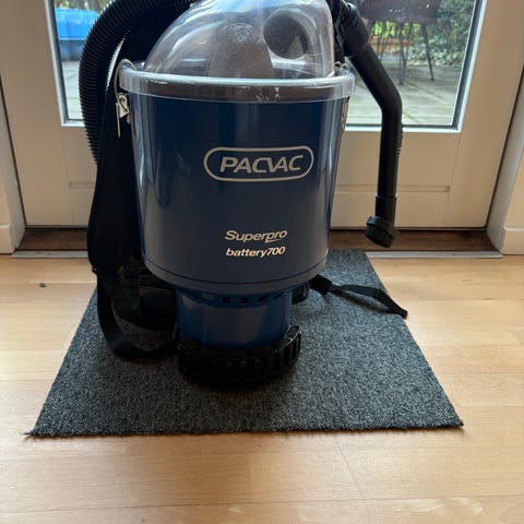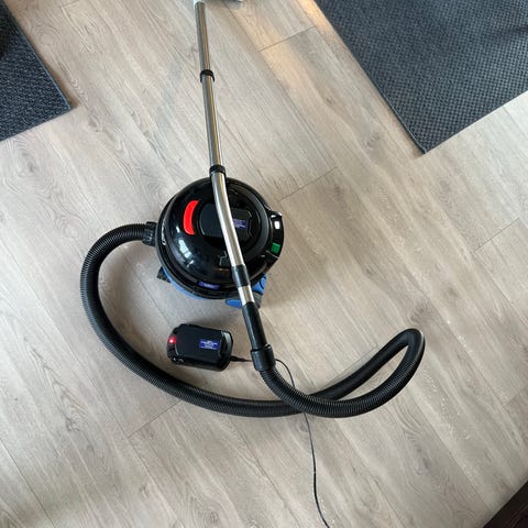 Komplet rygstøvsuger med slange, rør, mundstykker samt batteri.