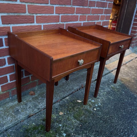 Sengebord i fineret teak på udvendig stel af eg .