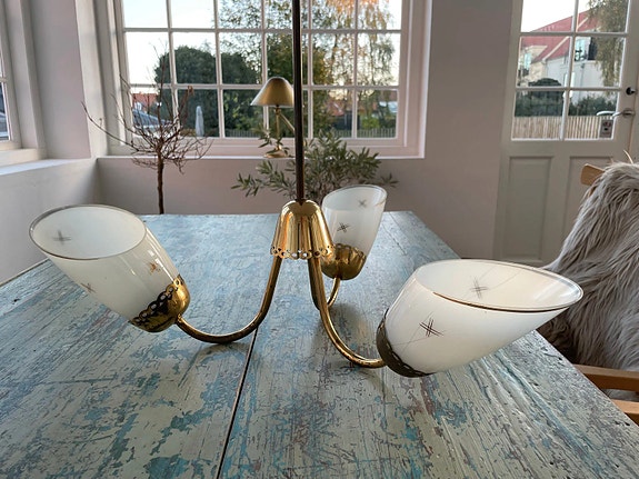 Smuk gammel kobberpendel, med en dekorativ teaktop, og med små stjerneformede udskæringer i selve skærmen.