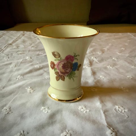 Rosenborg, KPM, Københavns porzelains maleri, Lyngby, Vase med blomster og guldkant, måler 10,5cm høj, 9cm i diameter. Hel og fin stand, pæn i guldkanten. Pris 140kr.