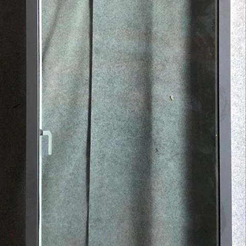Døren er i træ med alu glas liste og alu på trin. Den har en flænge ned langs låse stangen som vist på billedet.