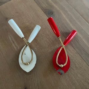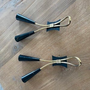 Den kræver lidt arbejde at få i gang, der skal trækkes nye ledninger til fatningerne, men så får man også en meget spektakulær væglampe fra 1960'erne. Sort oval bagplade med udskåret huller med messing kant. Og hele 5 messingarme med aflange røde fatninger i bedste Sputnik stil.