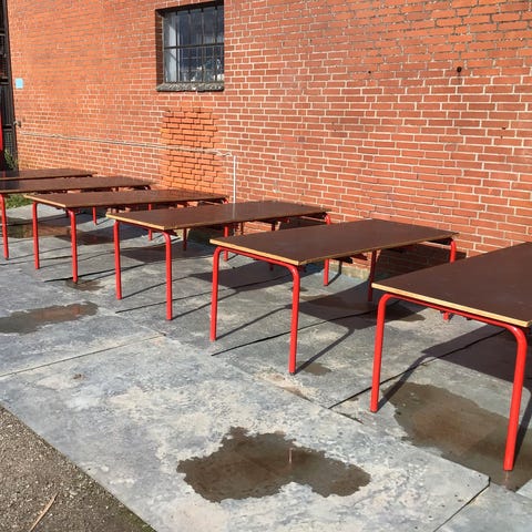 Bord og stole fremstår i meget pæn stand og i et lyst udtryk.