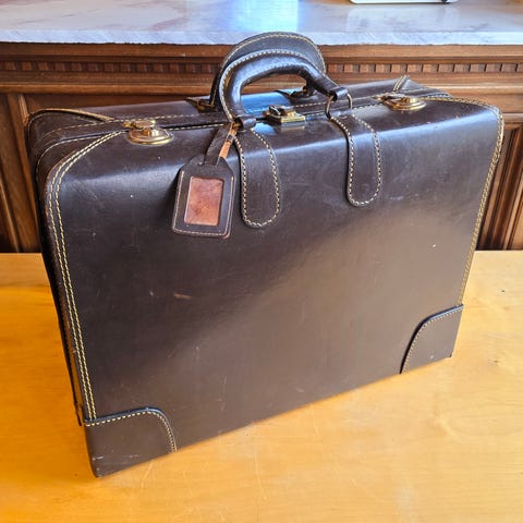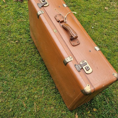 Vintage kuffert af pap / imiteret læder. Første halvdel 1900 tallet. God til udstilling eller butiksdekoration. Mål eks. håndtag H. 40. B. 61. D. 22 cm.