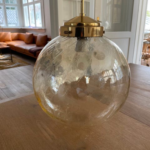 Så bliver det næsten ikke mere retro. Struktureret glaskuppel som er åben i bunden, med rød-orange ophæng.